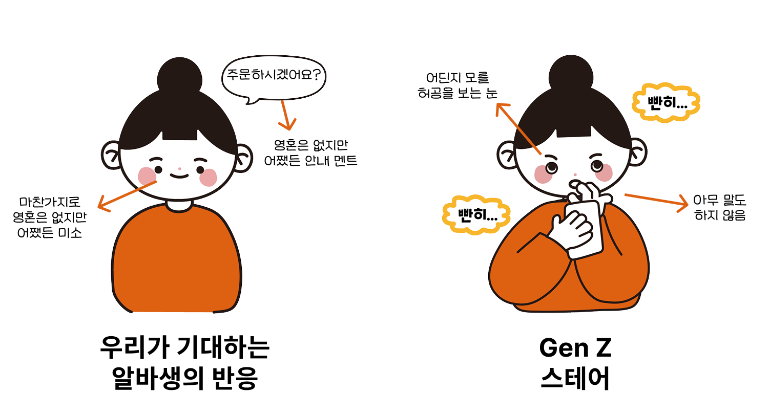 μ΄(Gen Z stare)βλΌλ λ§μ λ€μ΄λ³΄μ μ μμΌμ κ°μ? λκ΅°κ° λ§μ κ±Έμμ λ λ°μνμ§ μκ³ , μ무 λλ΅λ νμ§ μκ³ λ©ν μμ μΌλ‘ μλμ μΌκ΅΄μ μ³λ€λ³Έλ€κ³ ν΄μ Gen Z*(μ μ§μΈλ) + Stare(λΉ€ν μ³λ€λ΄)λΌ νλ΅λλ€.