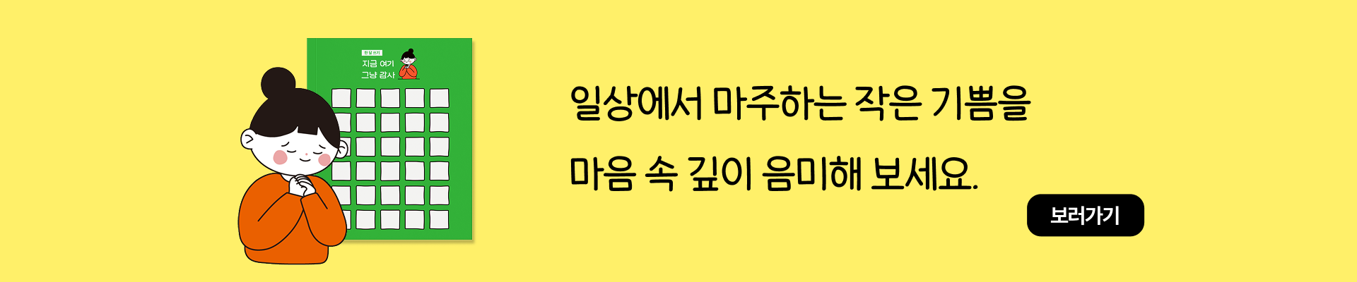 기초 체력으로 마음의 근육을 만들었다면, 이제 긍정적인 경험들로 근육을 강화할 차례예요. ‘좋은 경험을 해야 한다고?’라 생각하면 부담이 될 수 있는데요. 돈과 시간을 크게 들이지 않아도 되는 간단한 활동부터 시작해도 괜찮아요. 중요한 건, 긍정적인 경험을 자주 하고, 또 그 순간을 오래~ 음미하는 거예요.