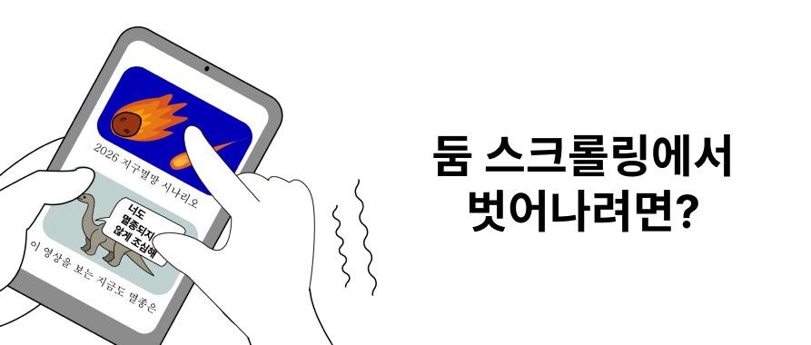 ์ ๊น๋ง ๋ณด๋ ค๊ณ ํ๋๋ฐ ์๊ฐ๋ฝ์ด ๋์์ด ๋ด๋ ค๊ฐ์ฃ . ์ด๋ฅธ๋ฐ ๋ ์คํฌ๋กค๋ง(doom scrolling)*์ด๋ผ ๋ถ๋ฅด๋ ์ด ํ๋์ ์ฐ๋ฆฌ ๋ฉํ์ ์์ฃผ ๋น ๋ฅด๊ฒ ๊ณ ๊ฐ์ํค๋ ์คํธ๋ ์ค ์ฃผ์์ธ์ด์์.