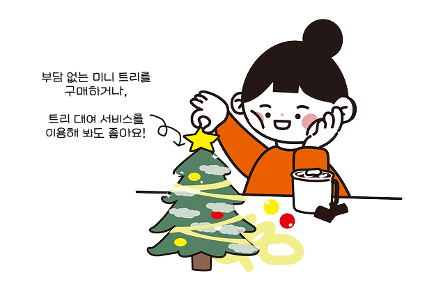 이럴 땐 ‘북적이는 연말’이 아닌 ‘오붓하고 조용한 연말'을 보내는 거예요. 조용한 성당이나 교회에서 잠시 머물러도 좋고, 친한 친구 한두 명과 카페에서 가벼운 스몰토크를 나누는 것도 좋아요. 또는 혼자서 조용히 지내고 싶다면, 트리를 직접 꾸미거나 좋아하는 캐롤을 잔잔하게 틀어두고 책을 읽거나 혼자 영화를 보는 것도 좋고요. |