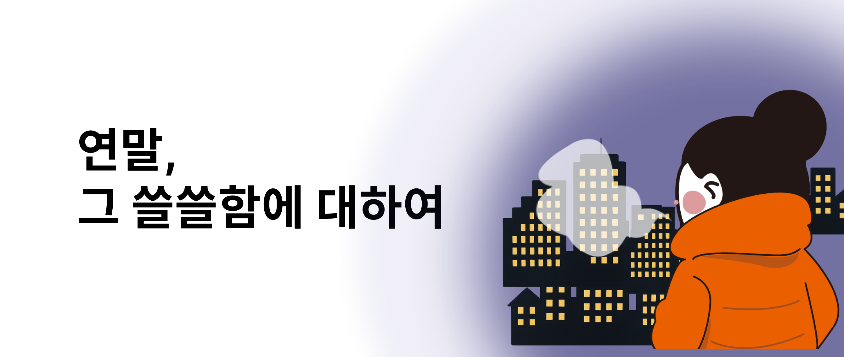해마다 연말이 되면 거리마다 사람들로 북적이는 분위기예요. 평소에는 외로움을 잘 느끼지 않는 편인데, 이상하게 이맘때만 되면 나만 외롭고 초라하게 느껴질 때가 있어요. 이번 호에서는 유독 연말마다 찾아오는 쓸쓸함의 원인과 그 마음을 어떻게 보살필 수 있을지에 대해 이야기해 보려 해요.